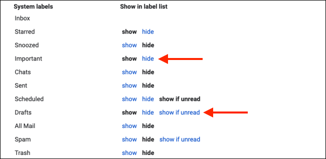 Trước tiên, chúng ta sẽ xử lý phần System labels (Nhãn hệ thống). Trong phần này, bạn có thể ẩn bớt các nhãn bạn ít/không sử dụng bằng cách bấm nút Hide (Ẩn) hoặc Show if unread (Hiển thị nếu chưa đọc) tương ứng.