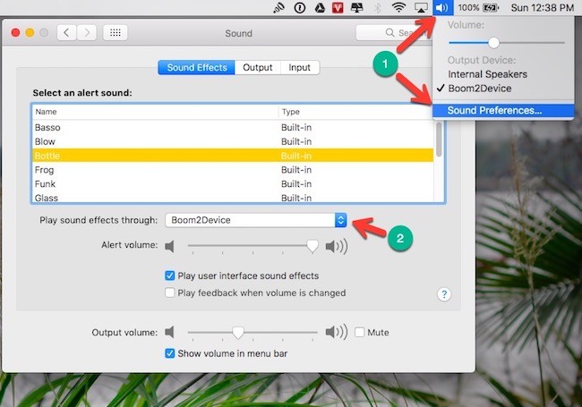 - Bước 1: Đầu tiên, bạn hãy nhấn vào biểu tượng loa ở góc trên bên phải và chọn Sound Preferences. Tiếp theo, bạn thiết lập lại là Boom2Device tại hai mục Sound Effects và Output.