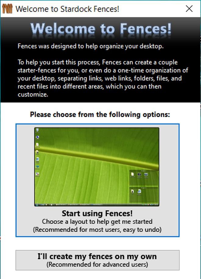Sau khi cài đặt và kích hoạt phần mềm, một hộp thoại hiện ra cho phép người dùng thiết lập cách hoạt động của Fences. Để sử dụng phần mềm được đơn giản, bạn nhấn vào tùy chọn "Start using Fences" từ hộp thoại hiện ra.