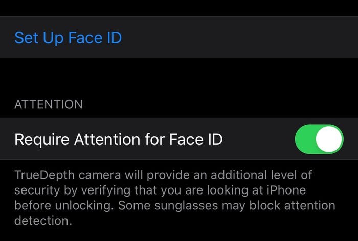 Bạn cũng nên thử tắt tùy chọn Require Attention for Face ID (Yêu cầu chú ý đến Face ID). Điều này có thể cải thiện cơ hội Face ID hoạt động khi bạn đeo khẩu trang. Tuy nhiên hãy nhớ rằng việc tắt tùy chọn này sẽ khiến Face ID kém an toàn hơn một chút, vì nó sẽ loại bỏ lớp xác thực yêu cầu bạn phải mở mắt và nhìn vào màn hình để mở khóa điện thoại. Bạn nên bật lại tùy chọn này khi sau này không cần dùng đến khẩu trang phòng dịch nữa.