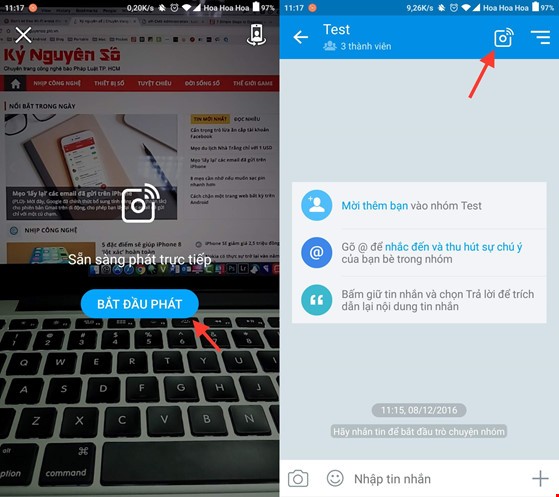 - Bước 3: Khi hoàn tất, người dùng chỉ cần nhấp vào biểu tượng live stream ở góc trên bên phải, thiết lập camera trước/sau rồi nhấn Bắt đầu phát. Trong quá trình phát, bạn có thể nhắn tin, gửi sticker, xem số lượng người đang theo dõi... Sau khi dừng phát, video sẽ được lưu lại trong nhóm và các thành viên khác có thể xem lại bất cứ lúc nào.