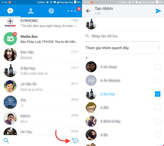 - Bước 2: Tính năng phát video trực tiếp (live stream) chỉ có thể hoạt động trong phần nhắn tin theo nhóm. Do đó, bạn hãy chuyển sang mục tin nhắn, chạm vào biểu tượng soạn thảo ở góc phải bên dưới, sau đó bạn phải chọn ít nhất hai thành viên.