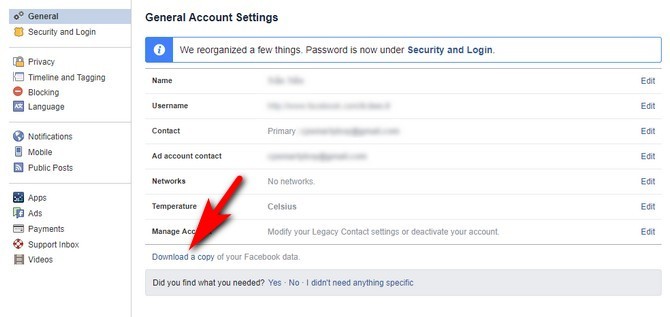 Mỗi tài khoản Facebook đều cho phép người dùng có thể tự động lưu trữ thông tin cá nhân và tải về bản mềm để sao lưu dễ dàng. Hãy truy cập trang Cài đặt của Facebook: Settings > General.