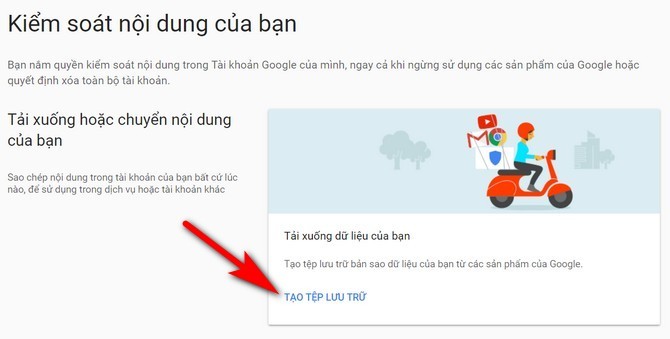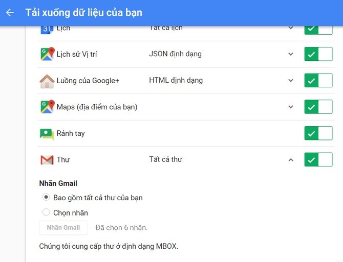 Cuối cùng bạn click chọn Create archive (Tạo tệp lưu trữ). Hãy ghi nhớ click chọn mục Mail để sao lưu toàn bộ dữ liệu email khi tải xuống tệp nén. Bạn có thể lựa chọn loại tệp, kích thước tệp lưu trữ tối đa (từ 1GB – 50GB) và cách tải về file sao lưu dữ liệu (gửi liên kết tải về qua email, thêm vào Drive, Dropbox và OneDrive).