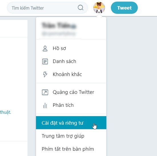 Chọn Cài đặt và Riêng tư trong Cài đặt Twitter