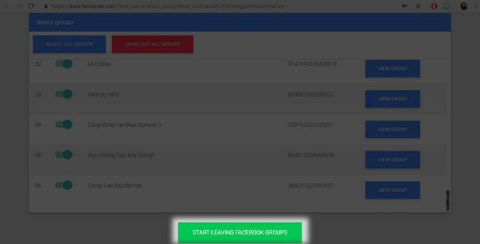 Bước 3: Nhấn vào mục SELECT ALL GROUPS để chọn toàn bộ Group. Hoặc chọn từng Group mà bạn muốn thoát. Sau đó click chuột vào START LEAVING GROUP FACEBOOK.