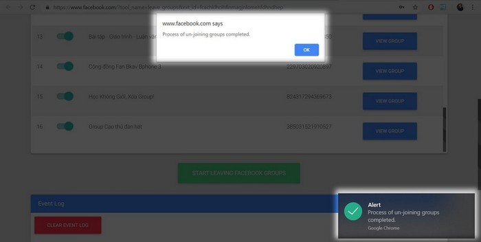 Bước 4: Bạn đợi để công cụ thực hiện trong giây lát tùy thuộc vào số group mà bạn muốn thoát là nhiều hay ít, trong tài khoản Facebook của mình có rất nhiều group mà mình muốn rời khỏi.