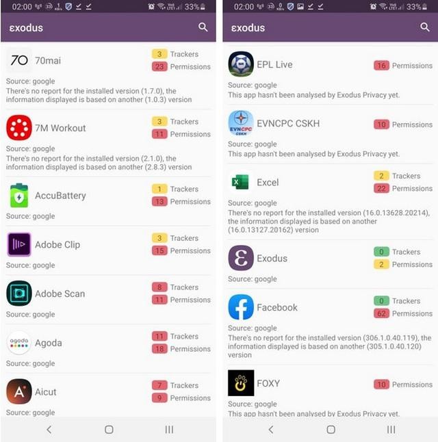Exodus là ứng dụng nhỏ gọn và miễn phí, có chức năng chính là quét toàn bộ các ứng dụng đã cài đặt trên smartphone, sau đó liệt kê đầy đủ quyền hạn mà smartphone cấp cho các ứng dụng cũng như chỉ rõ các ứng dụng nào đang thu thập thông tin, thói quen sử dụng smartphone của người dùng.