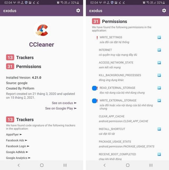 Ngoài những quyền hạn, Exodus còn có thể xác định được những ứng dụng nào có thể thu thập các thông tin từ quá trình hoạt động của người dùng (tracker).