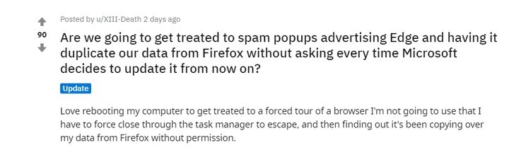 Một số người dùng đã xác nhận trên mạng Reddit, tình trạng này đang xảy ra trên máy tính của họ. Một vài người dùng chia sẻ rằng, họ cảm thấy khó chịu khi bị buộc phải trải nghiệm trình duyệt mặc định mới. Kết cục là họ buộc phải tắt trình duyệt qua Task Manager trước khi phát hiện ra bí mật trên.
