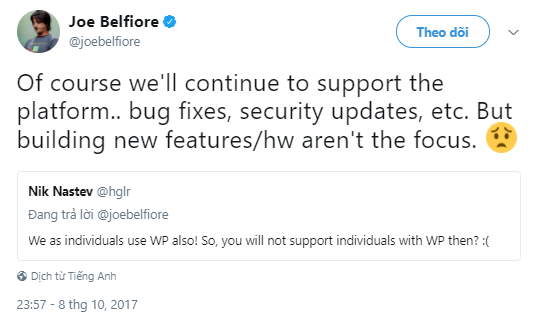 Theo Engadget, Phó Chủ tịch mảng Windows Joe Belfiore vừa thông báo trên Twitter rằng việc phát triển tính năng và sản phẩm phần cứng mới cho Windows 10 Mobile "không còn là trọng tâm" của Microsoft. Sẽ vẫn có những bản cập nhật sửa lỗi và bảo mật, nhưng bạn đừng trông mong gì nhiều hơn.