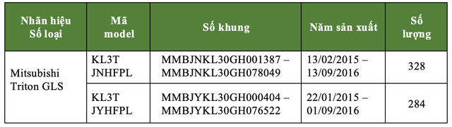 Có hơn 612 chiếc bán tải Triton GLS cần được triệu hồi để thay thế đinh tán của ốp che bệ bước chân có thể bị ăn mòn, dẫn đến tình trạng gãy và rơi ra khỏi xe, làm tăng nguy cơ tai nạn. Các mẫu xe phải triệu hồi này đều do Mitsubishi Việt Nam nhập khẩu từ Thái Lan.