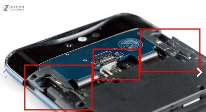 Theo GSMArena, bộ phận camera trượt của Oppo Find X hoạt động tương tự như trên smartphone Vivo NEX S với bộ truyền động tuyến tính. Ở ảnh dưới, bạn có thể thấy động cơ của nó (phần trong ô màu vàng) và các thanh đường ray trượt (phần trong ô màu đỏ). Phần trong ô màu xanh là các dây cáp kết nối máy ảnh, thiết bị quét khuôn mặt 3D và các thành phần khác với phần còn lại của điện thoại.