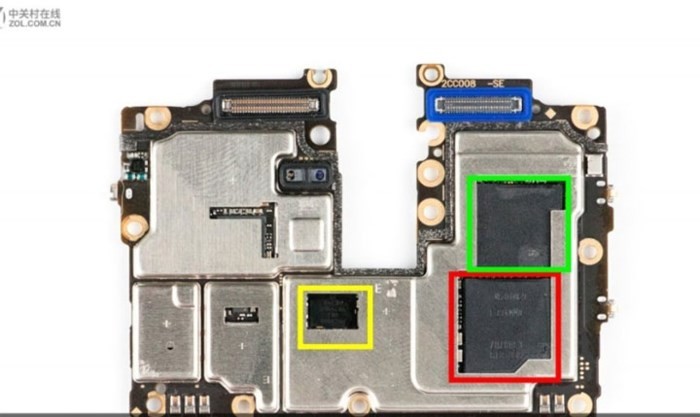 Đỏ - con chip Snapdragon 845 và 8GB RAM, xanh - bộ nhớ trong 128GB, vàng - IC quản lý năng lượng