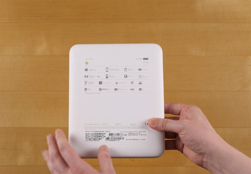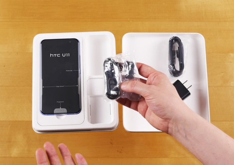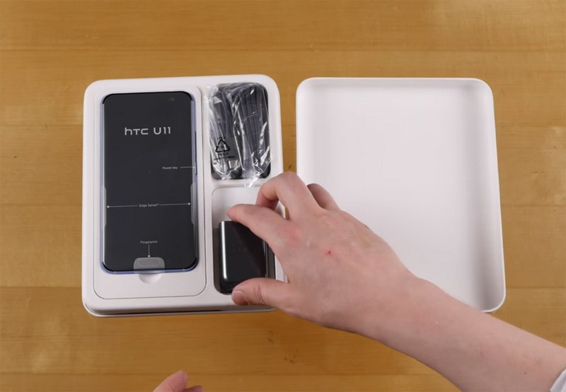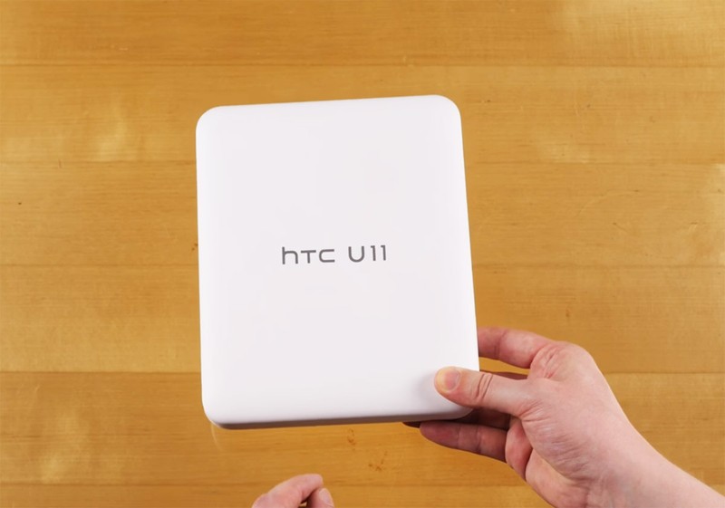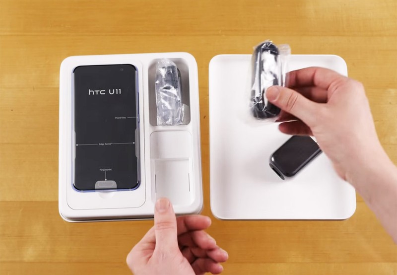 | HTC U 11 được đóng gói trong một chiếc hộp nhựa hình chữ nhật có kích thước khá lớn. Mặt trước có dòng chữ tên sản phẩm |