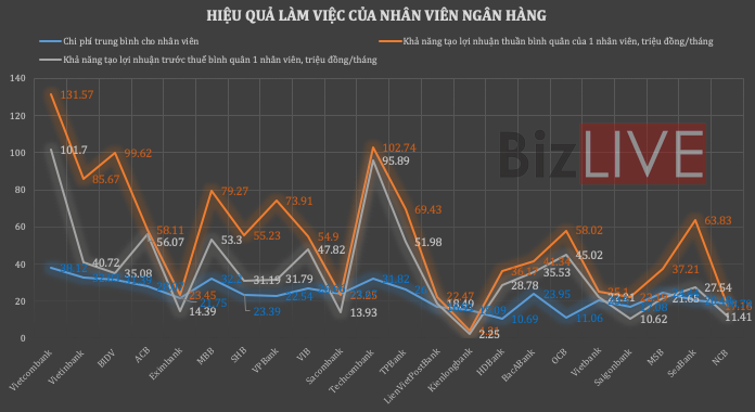 So với con số đạt được trong năm 2018 là 124,24 triệu đồng lợi nhuận thuần/người/tháng và 88,43 triệu đồng lợi nhuận trước thuế/người/tháng, có thể thấy hiệu quả làm việc của nhân viên ngân hàng này đã tăng khá nhiều.