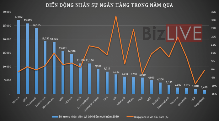 Tương tự, nhân sự tại TPBank cũng tăng tới 24,4% trong năm qua, lên 6.200 người; Vietbank tăng 19,7%, lên 2.300 người.