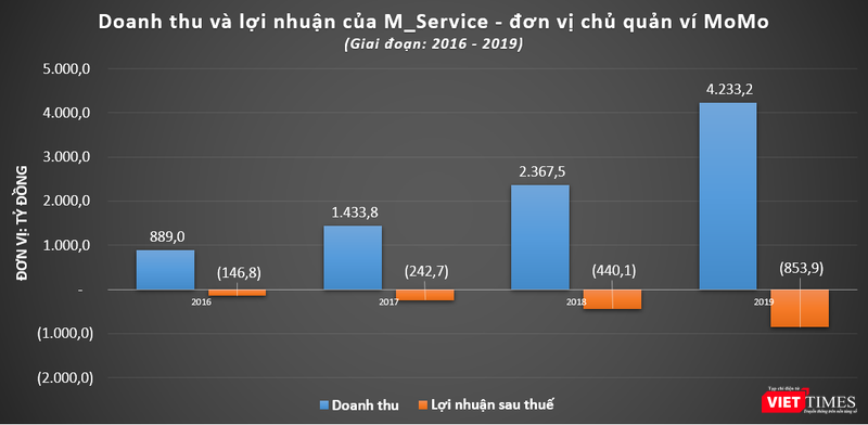 Dữ liệu của VietTimes cho thấy, song song với sự tăng trưởng số lượng người dùng MoMo, doanh thu của M_Service trong giai đoạn 2016 – 2019 cũng có sự tăng trưởng đáng nể. Riêng trong năm 2019, doanh thu của M_Service đạt mức 4.233,2 tỷ đồng, cao gấp 4,7 lần năm 2016.