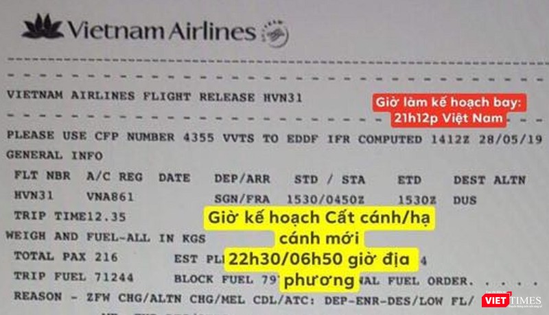 Tuy nhiên, ở đây cần lưu ý rằng lịch bay của VN31 sau đó đã được điều chỉnh. Giờ khởi hành dự kiến của VN31, theo CFP (Company Flight Plan – kế hoạch bay), được xác định là 22h30 (Nên biết, CFP trên được lập vào 21h12 ngày 28/5/2019 giờ Việt Nam (14h12 giờ GMT) – tức là thời điểm này hãng đã biết sẽ có khách nối chuyến từ VN279).