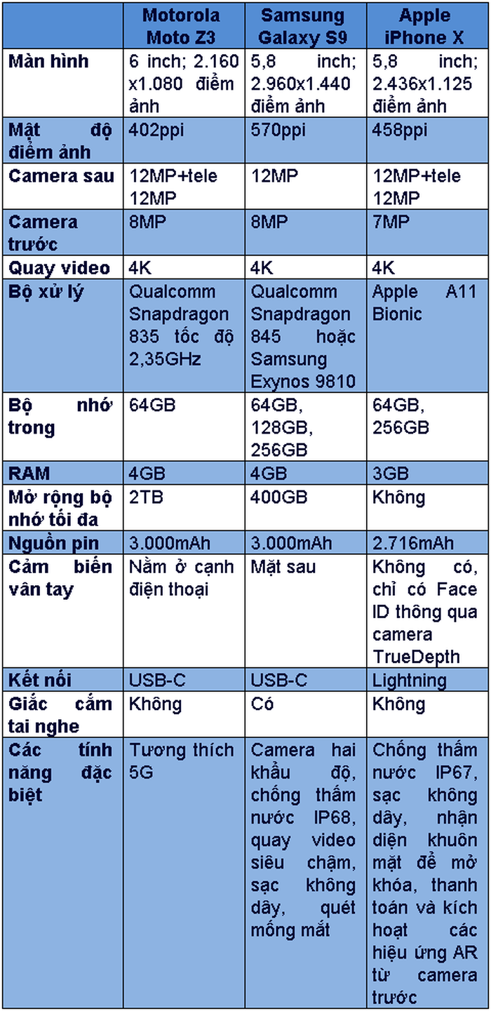 Là smartphone hàng đầu của Motorola, Z3 sẽ phải cạnh tranh với các điện thoại Android hàng đầu khác như Galaxy S9 cũng như iPhone X của Apple. Để xem Moto Z3 có gì tốt hơn so với các đối thủ, chúng ta hãy cùng xem bảng so sánh thông số kỹ thuật dưới đây: