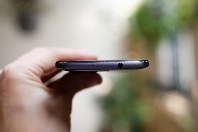 Thiết kế khiến nhìn từ hông trông điện thoại mỏng dù kích thước thực tế 7,9 mm. Cảm giác cầm máy hơi cấn tay, không thoải mái như Galaxy J7 Prime hay F1s 2017. Bù lại, Moto M có khả năng chống nước.