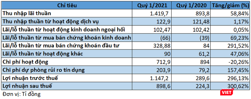 Ngân hàng TMCP Hàng Hải Việt Nam (Mã CK: MSB) vừa công bố cáo cáo tài chính hợp nhất Quý 1/2021 với lợi nhuận trước thuế đạt 1.147 tỉ đồng, tăng 296% so với cùng kỳ năm trước; lợi nhuận sau thuế đạt 898,6 tỉ đồng, tăng hơn 300% so với cùng kỳ năm 2020.