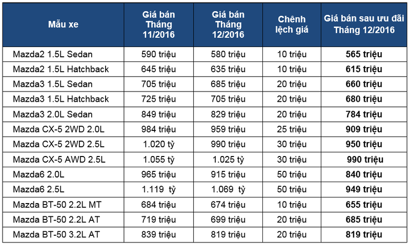 Chi tiết, bảng giá xe Mazda áp dụng trong tháng 12 như sau: