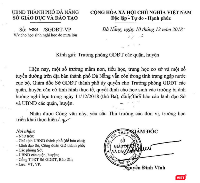 Cập nhật mới hơn, cuối giờ chiều hôm nay (10/12), Giám đốc Sở Giáo dục và Đào tạo Đà Nẵng Nguyễn Đình Vĩnh cũng đã ký văn bản gửi Trưởng phòng GD&ĐT các quận huyện trên địa bàn thành phố, ủy quyền cho các Trưởng phòng căn cứ tình hình thực tế, quyết định cho học sinh các trường bị ảnh hưởng nghỉ học vào ngày mai Thứ Ba (ngày 11/12/2018).