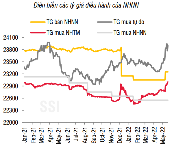Theo SSI, diễn biến này một phần đến từ áp lực từ vĩ mô (áp lực lạm phát tăng trong khi lãi suất được NHNN giữ đi ngang nhằm hỗ trợ nền kinh tế). Tuy nhiên, so với các quốc gia trong khu vực, mức mất giá của VND vẫn ở trong vùng chấp nhận được (thấp hơn mức đỉnh vào tháng 3/2020).