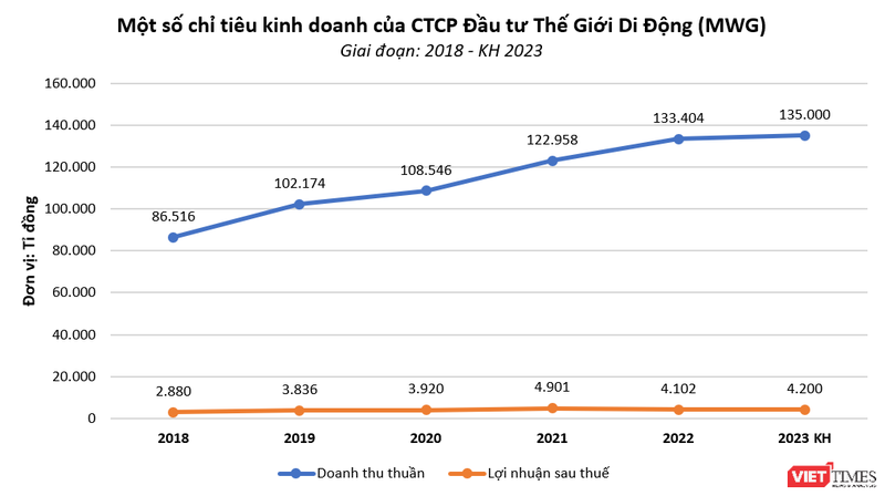 Theo đó, năm 2023, MWG lên kế hoạch doanh thu thuần 135.000 tỉ đồng và lợi nhuận sau thuế 4.200 tỉ đồng, lần lượt tăng 1% và 2% so với thực hiện năm 2022.