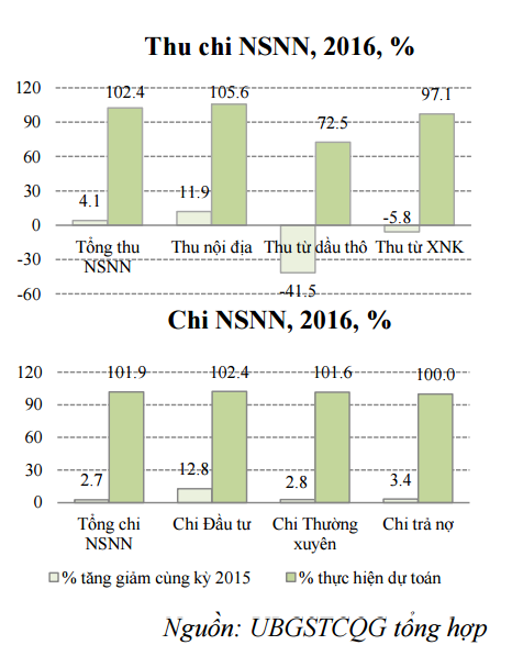 Phân tích cơ cấu thu chi NSNN cho thấy, thu nội địa đã bù đắp giảm thu từ thuế xuất nhập khẩu và thu từ dầu thô. Nợ công tiếp tục tăng, từ mức 62,2% GDP của năm 2015 lên mức dự kiến 64,98% năm 2016 do: bội chi NSNN vẫn ở mức cao; tăng trưởng kinh tế giảm, GDP danh nghĩa đạt thấp hơn kế hoạch.