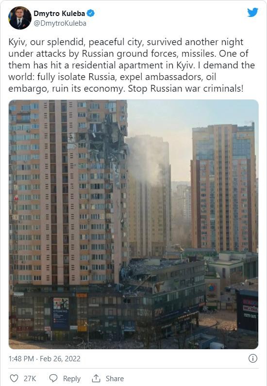 “Tôi đề nghị thế giới: hãy cô lập hoàn toàn Nga, trục xuất các đại sứ của họ, cấm mua dầu của họ, tiêu hủy nền kinh tế của họ” – ông Kuleba viết trên Twitter, kèm một bức ảnh cho thấy một tòa nhà chung cư ở Kiev bị bắn phá.