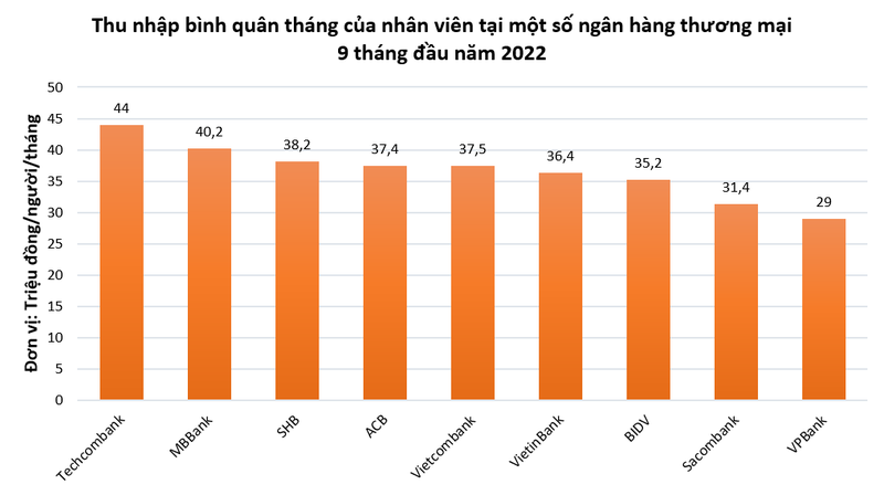Một số ngân hàng khác cũng ghi nhận mức lương bình quân của nhân viên ở mức cao như Sacombank (31,4 triệu đồng/người/tháng), VPBank (29 triệu đồng/người/tháng), TPBank (27,5 triệu đồng/người/tháng), SeABank (28 triệu đồng/người/tháng).