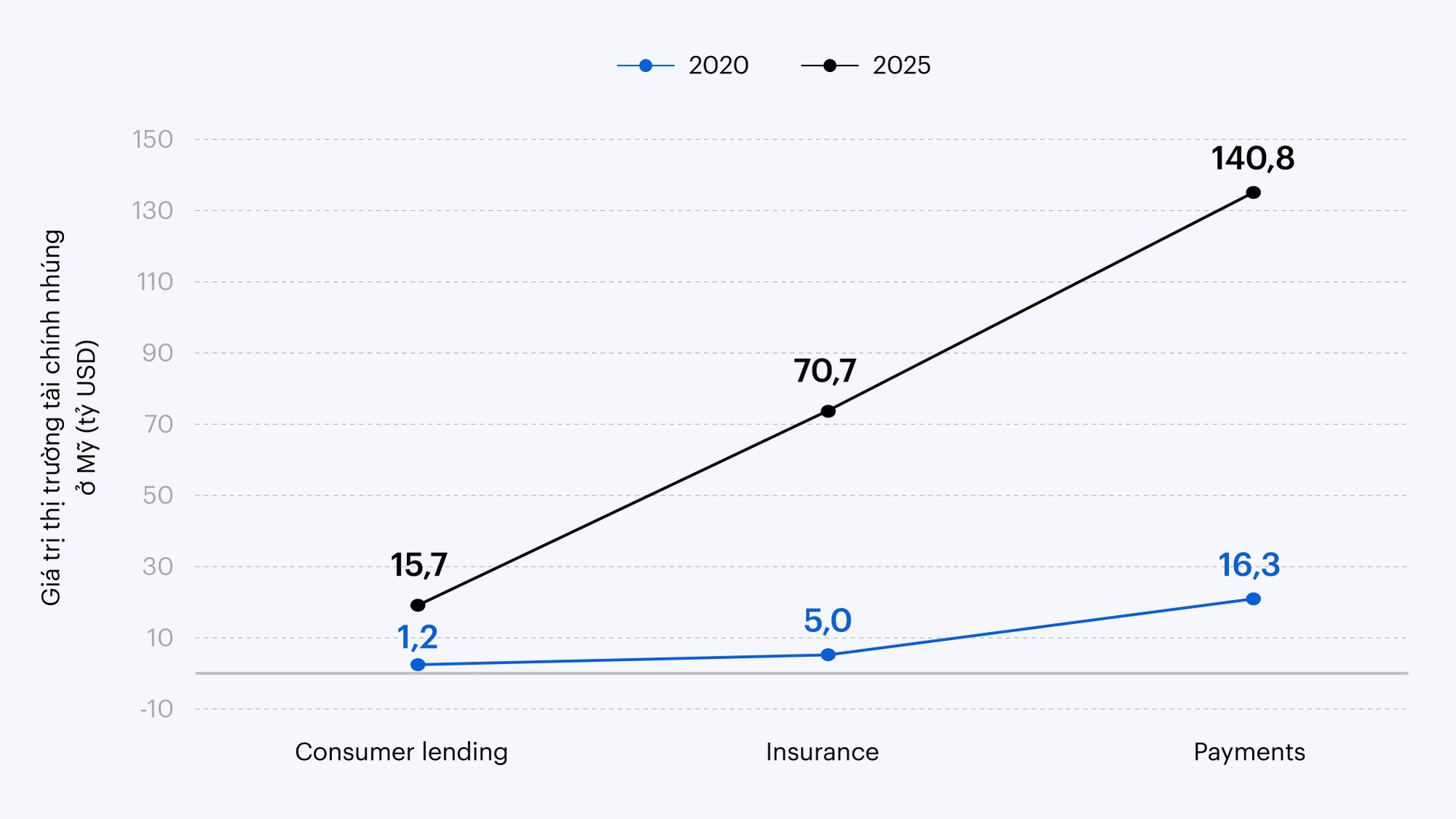 Tại Hoa Kỳ, doanh thu do tài chính nhúng tạo ra vào năm 2020 ước tính là 22,5 tỉ USD và được dự báo sẽ đạt hơn 230 tỉ USD vào năm 2025 với mức tăng trưởng 10 lần. Tài chính nhúng đã giúp 88% các công ty tăng tương tác với khách hàng và 85% nói rằng tài chính nhúng giúp họ gia tăng thị phần.