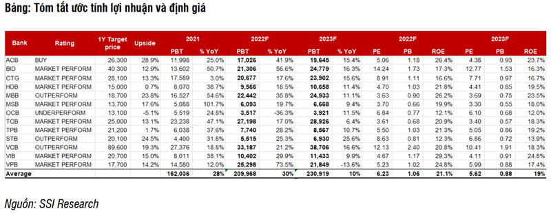 Theo SSI Research, rủi ro liên quan đến bất động sản, trái phiếu doanh nghiệp và xu hướng lãi suất tăng cùng với sự tăng trưởng chậm lại của nền kinh tế chưa được phản ảnh hoàn toàn vào định giá cổ phiếu ngân hàng.