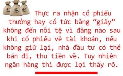 Mối quan tâm hàng đầu của cổ đông ngân hàng hiện nay là cổ tức. Hầu hết các ngân hàng chia cổ tức bằng cổ phiếu. Hãn hữu mới có ngân hàng chia cổ tức tiền mặt, mà tỷ lệ cũng thấp. Lý do là tổ chức tín dụng nào cũng muốn tăng vốn điều lệ, tăng vốn chủ sở hữu. Cho nên chia cổ phiếu thưởng, trả cổ tức bằng cổ phiếu từ nguồn vốn thặng dư, từ lợi nhuận để lại là gọn nhất. Tóm lại mùa đại hội năm nay, cổ đông ngân hàng nhận “giấy”, không được nhận tiền mặt.