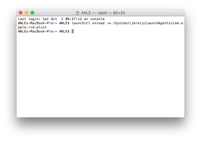 launchctl unload -w /System/Library/LaunchAgents/com.apple.rcd.plist