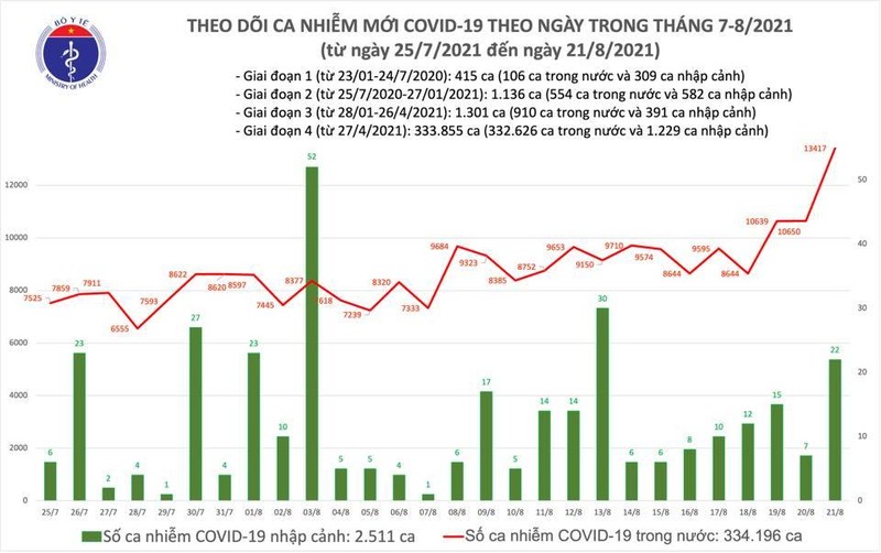 Cụ thể, tính từ 18h30 ngày 20/8 đến 18h ngày 21/8, cả nước ghi nhận 11.321 ca nhiễm mới, trong đó 22 ca nhập cảnh và 11.299 ca ghi nhận trong nước, trong đó có 7.428 ca trong cộng đồng.