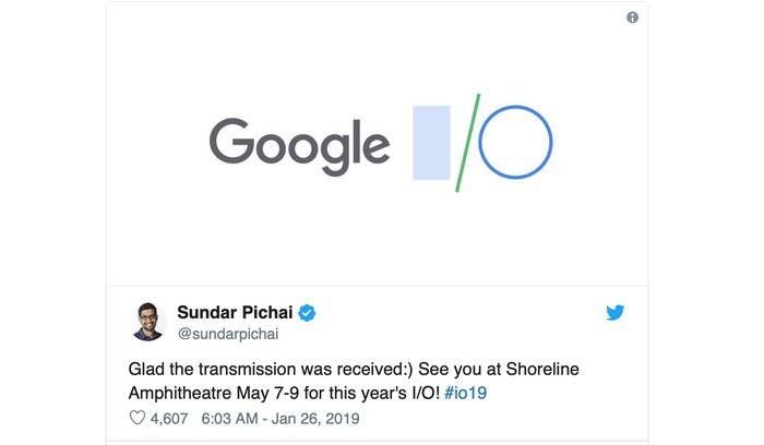 CEO Google đăng thông tin về thời gian diễn ra sự kiện I/O 2019 trên Twitter.