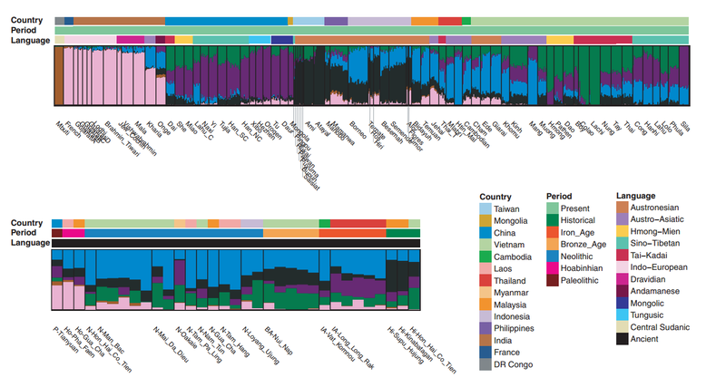 Bảng 1: Các dải màu sắc quy ước cho các tộc người trong biểu đồ này (màu giống nhau, chạy liên tục) cho thấy tình trạng “lai” giữa các dân tộc là hiển nhiên. Ảnh: Nhóm nghiên cứu cung cấp.