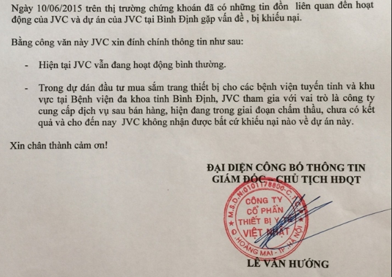 Đến ngày cuối tuần 13/06/2015, bằng văn bản trên website của công ty, CTCP Thiết bị y tế Việt Nhật đã chính thức cho biết công ty vẫn đang hoạt động bình thường. Trong dự án đầu tư mua sắm thiết bị cho các bệnh viện tuyến tỉnh và khu vực tại bệnh viện đa khoa tỉnh Bình Định, JVC là đơn vị cung cấp dịch vụ sau bán hàng, hiện đang trong giai đoạn chấm thầu, chưa có kết quả và hiện nay, JVC không nhận được bất kỳ khiếu nại nào về dự án này.