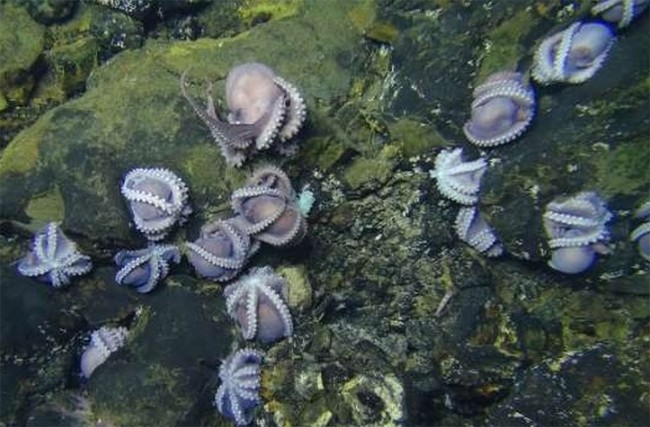 Hàng chục con bạch tuộc này được tìm thấy sâu bên trong một bãi đá dưới biển trong khi các nhà địa chất học khám phá và thu thập các mẫu chất lỏng ấm nổi lên từ các vết nứt trên đá núi lửa. Những con bạch tuộc này thuộc về chi Muusoctopus, đó là những sinh vật màu hồng với đôi mắt to.