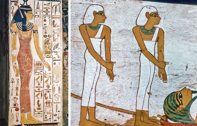 Trang phục của phụ nữ Ai Cập được gọi là kalasiris - một chiếc váy bó sát với một hoặc 2 dây. Chiếc váy là chiếc váy để lộ phần vai của người phụ nữ. Nó không chỉ dành cho những người hầu, phụ nữ của các tầng lớp bình thường, các nữ tu sĩ (như những người trong bức tranh bên phải), mà còn cho những người phụ nữ cao quý. Ngoài ra, các nữ thần như Nefertari cũng mặc kalasiris.