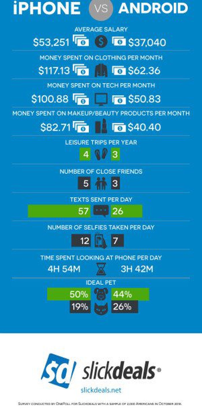 CEO Josh Meyers của những khảo sát Slickdeals cho biết: "Cuộc khảo sát này chỉ ra rằng những người dùng Android nói chung tiết kiệm và thích được ưu đãi khi mua hàng hơn so với đối thủ iPhone của mình. Cũng như việc fan Táo thì có xu hướng chi tiêu "thoáng hơn", đặc biệt những mặt hàng liên quan đến vẻ bề ngoài như quần áo và mỹ phẩm".