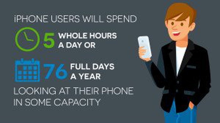 Cụ thể một người dùng iPhone sẽ dành 5 giờ/ngày, 76 ngày/năm để sử dụng điện thoại. Bao gồm gửi tới 58 tin nhắn văn bản mỗi ngày - gấp đôi so với các chủ sở hữu Android là 26 tin mỗi ngày. Điều đó cũng bao gồm cả việc các fan Android chỉ dùng điện thoại 4 tiếng/ngày: