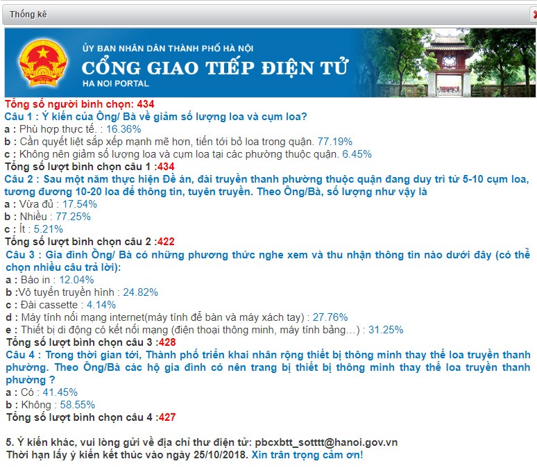 Theo kết quả ban đầu của cuộc khảo sát lấy ý kiến người dân sau một năm thực hiện Quyết định số 5133/QĐ-UBND ngày 1/8/2017 của UBND thành phố về phê duyệt Đề án "Sắp xếp lại và nâng cao chất lượng, hiệu quả hoạt động đài truyền thanh phường, xã, thị trấn trên địa bàn thành phố Hà Nội”, tính đến tối ngày 11/10, trong số gần 430 người thực hiện khảo sát này, có tới hơn 77% ý kiến cần quyết liệt sắp xếp mạnh mẽ hơn, tiến tới bỏ loa trong quận và đánh giá mỗi quận có số lượng từ 10 đến 20 loa vẫn là nhiều. Tuy nhiên, gần 59% người tham gia khảo sát không đồng ý với việc trang bị thiết bị thông minh để thay thế loa truyền thanh phường. Có đến gần 60% số người được hỏi cho biết thu nhận thông tin qua internet, bằng thiết bị thông minh như điện thoại, máy tính bảng hay máy tính để bàn, máy tính xách tay. Kết quả khảo sát cũng cho thấy chỉ có hơn 12% số người tham gia trả lời còn đọc báo in.
