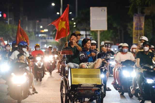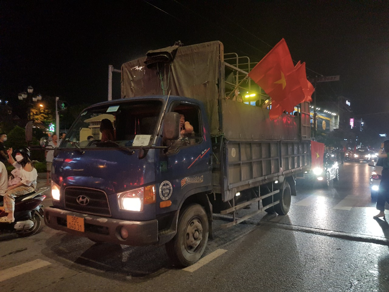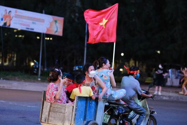 Nhiều người còn ngồi lên cả thùng xe 3 bánh để phất cờ, nhảy múa, hát ca, hô vang Việt Nam chiến thắng.
