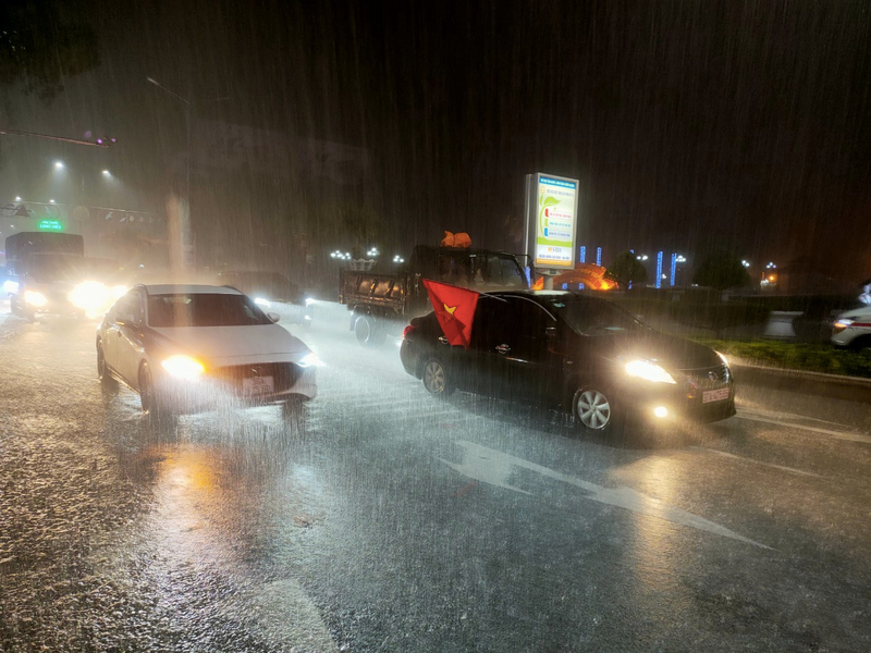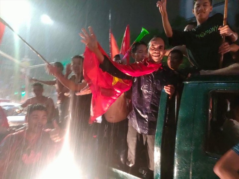 Cổ động viên Thanh Hóa không ngại mưa như trút nước vẫn đổ ra đường mừng "mưa" chiến thắng của đội U23 và đoàn Thể thao Việt Nam.