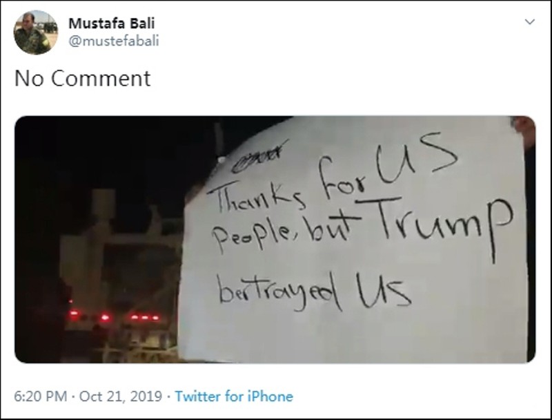 Ông Mustafa Bali, phát ngôn viên của lực lượng người Kurd “Lực lượng Dân chủ Syria” (SDF) đã liên tiếp đăng tải ba đoạn video lên mạng truyền thông xã hội cung ngày 21/10, cho thấy có người dân giương biểu ngữ trước đoàn xe quân Mỹ đang di tản ở Tal Tamr vào tối hôm 20/10: “Các người đã phản bội chúng tôi, các người sẽ bị nguyền rủa”.