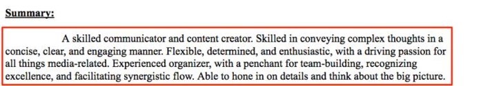 "Sau một lúc, các bản tóm tắt dường như hóa thành một chương dài trong một cuốn sách", Nicolai nói. "Sẽ tốt hơn nếu liệt kê một vài đầu dòng với những thành tích nổi bật và một câu chốt đậm tính thương hiệu, ‘Được biết đến với việc đạt được XYZ'".